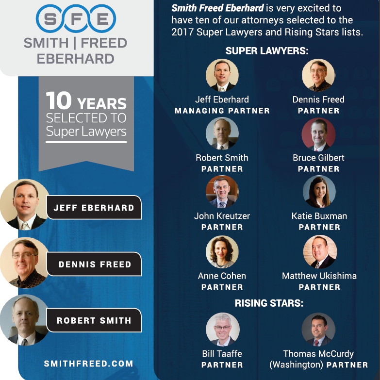 Smith Freed Eberhard is very excited to have ten of our attorneys selected to the 2017 Super Lawyers list. It is quite an honor to have multiple members of our team on this prestigious list. To be included on this reputable list attorneys are selected through a multi-phase process; including, peer nominations and evaluations. Candidates are evaluated on peer recognition and professional achievement.