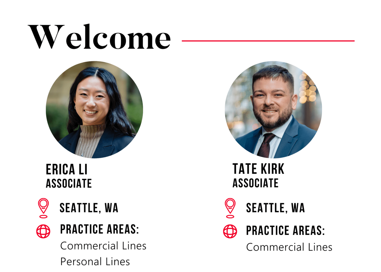 Please join us in welcoming Erica Li and Tate Kirk – two of our new Associate Attorneys at Smith Freed Eberhard’s Seattle, WA office!