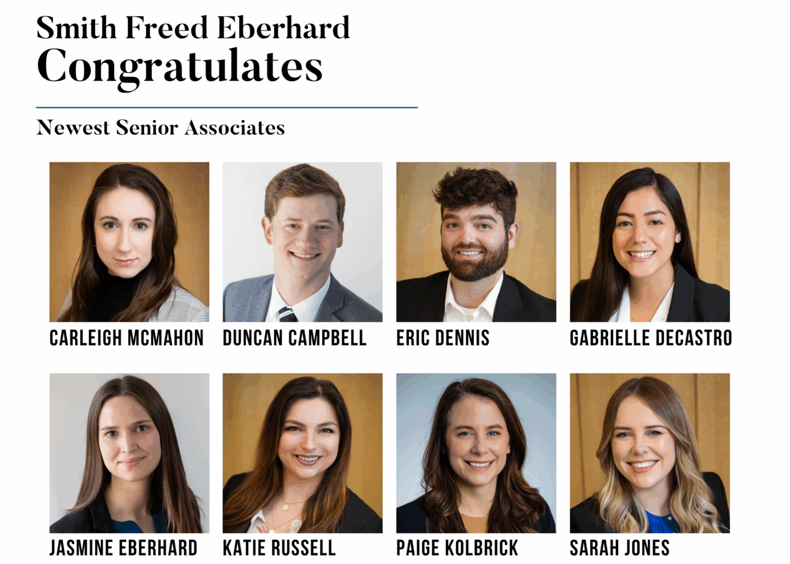 Please join us in congratulating Carleigh McMahon, Duncan Campbell, Eric Dennis, Gabrielle Martinez deCastro, Jasmine Eberhard, Katie Russell, Paige Kolbrick, and Sarah Jones on being promoted to Senior Associate Attorneys at Smith Freed Eberhard. We take great pride in growing new attorneys into leaders. Becoming a Senior Associate is an important milestone to achieve. It demonstrates that you have the skills to handle complex litigation for our clients. Being promoted to Senior Associate also says that you are the future of our firm. We want to congratulate each of you on this achievement.
